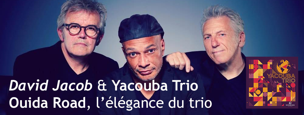 Dans le monde du trio jazz piano / basse / batterie, il faut désormais compter avec le Yacouba Trio, formé par David Jacob (b), avec Nicolas Noël (pno) et Hakim Molina (dms). Le moins que l’on puisse dire est que le parcours de Jacob est original, lui qui est depuis trente ans le bassiste de Trust, mais a aussi collaboré avec Geoffrey Oryema, le bluesman Ladell McLin ou encore la chanteuse Ilene Barnes. Avec Ouida Road, paru en avril dernier, David Jacob nous prend par la main pour un voyage entre fondements du jazz et racines africaines.